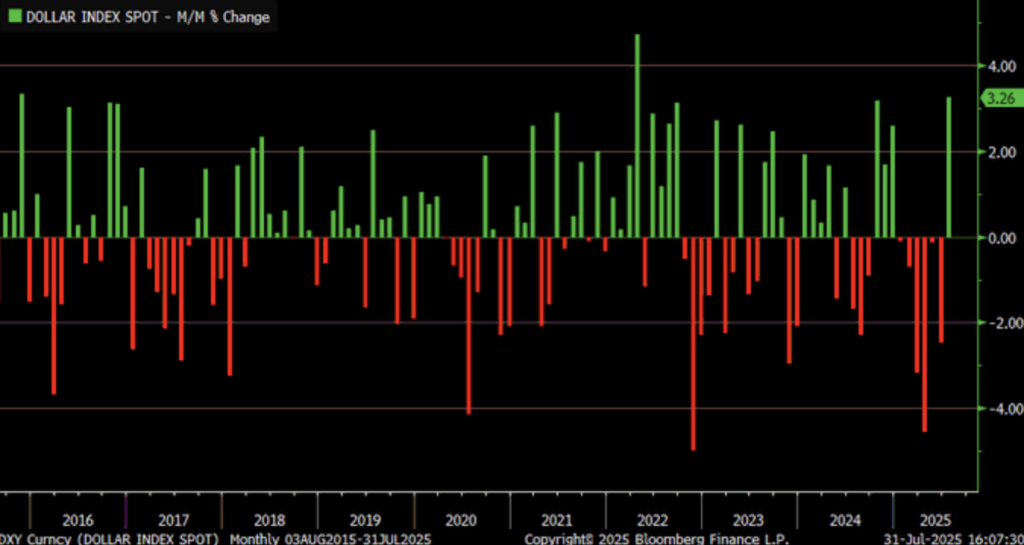 We observed the U.S. dollar recording a robust 3.32% gain in July 2025—its sharpest monthly climb since April 2022—despite a 4.12% year-on-year decline. This rebound appears to stem from a complex interplay of short-term risk aversion and shifting trade dynamics, reinforced by a modest daily uptick of 0.22% to 100.0372. The momentum coincides with fresh trade data showing a significant drop in the U.S. goods trade deficit in June, the lowest in nearly two years. We attribute this to weaker import demand and potential dollar support from reduced external spending, alongside structural labour effects tied to recent policy shifts.