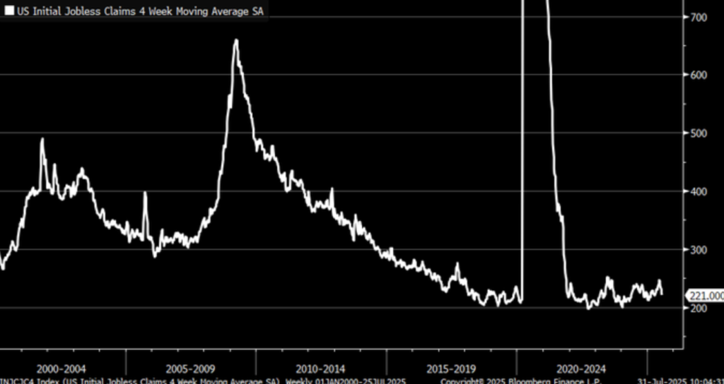 The first U.S. unemployment claims 4-week average dipped below 200,000—the trough since the early 2020 months—the gauge of solid labour market optimism in the face of best recession expectations. A stark contrast with past norms, much more so than the 2008–2009 recession, during which claims breathtakingly breached the 700,000 mark. Such a decrease indicates solid hiring trends and company optimism in the face of top-line economic numbers whose indicators are at variance.