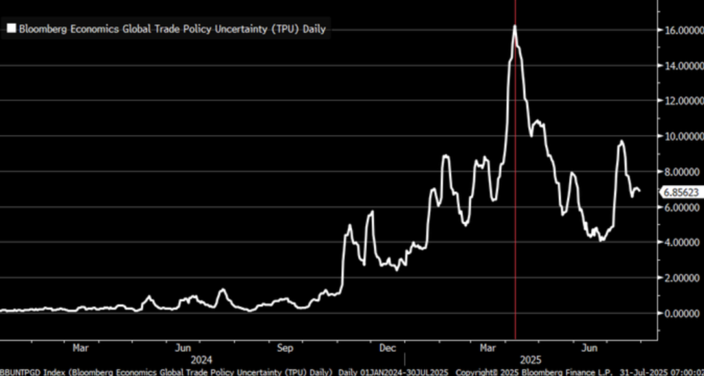The Bloomberg Economics Trade Policy Uncertainty Index spiked at a record high in early 2025 as markets were wary of rapid U.S. trade aggression like tariff threats that shook global supply chains. But the precipitous falls through July 31 more closely resemble the opposite of that scene, much as behavior finance laws matching emotional euphoria with corrections. The flipped-about reversals indicate markets have priced in policy predictability—or at least momentary stability—their peak episode of peak geopolitical unpredictability.