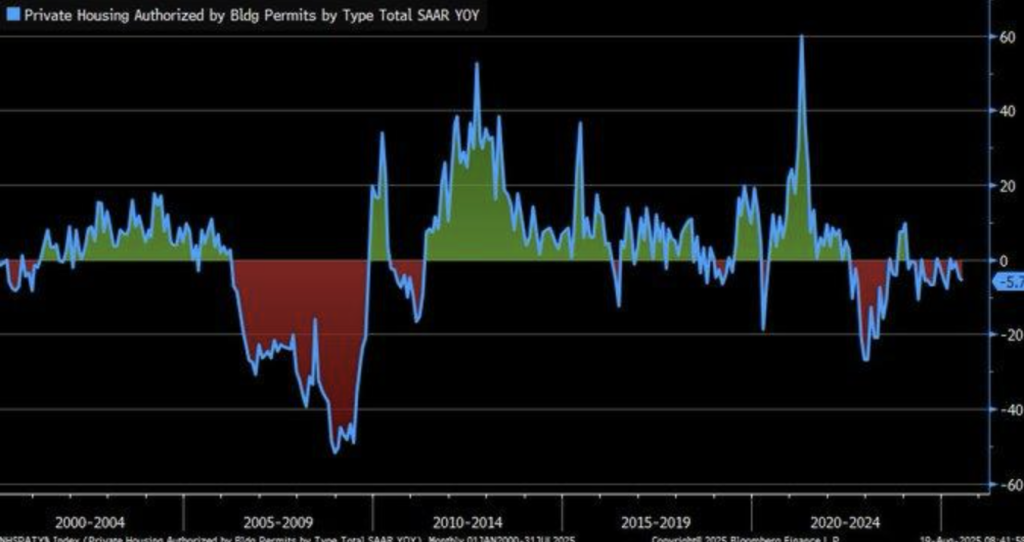 Latest figures regarding U.S. building permits report a dismal year-on-year fall as permits decreased by 5.7% in July 2025 compared to July 2024, according to the U.S. Census Bureau. As this seasonally adjusted annual rate of permits decreases to 1,354,000 in this trend, bad signs are signaled regarding slowing in the housing market. Building permits are one of the best indicators of future housing action with a fall potentially indicating tighter supply in housing with a resultant impact in economic trends.