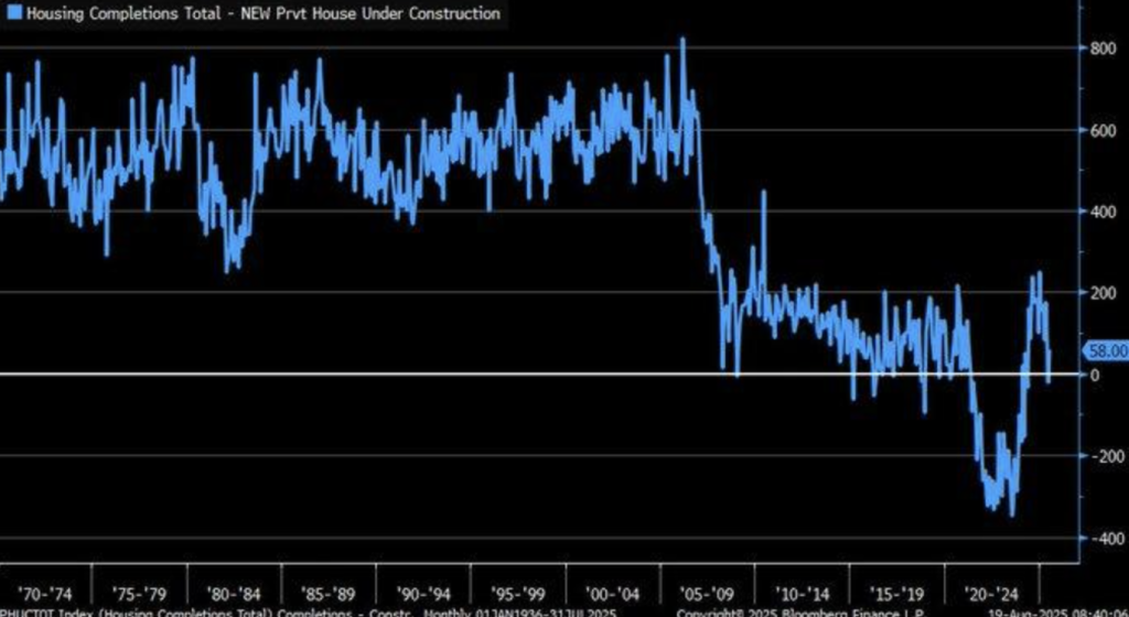 Current data reflect a significant fall in spread between completions and homes under construction. The pre-pandemic level decline is a signal of slowing productivity in construction. Until July 2025, as the gap shrinks, this is a signal of future construction slowdowns or inefficiencies. The trend is even reaffirmed by the U.S. Census Bureau’s New Residential Construction report which registers a slowing pace of construction though demand for housing gathers pace.