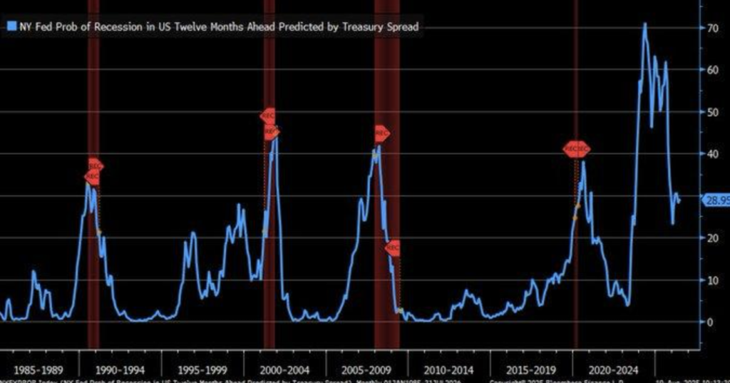 The recent reading on this gauge through the Treasury yield curve spread, which captures the spread between the 10-year and 3-month Treasury rates, shows a declined 29%-probability recession within the next 12 months from its last reading at 70% during previous 2025 periods. The decline may be signaling stabilization of the economy which may be causally related to a recent détente on U.S.-China tariffs. While histories on this gauge going back as far as to periods from around the 1960s to the 2020s show high correlation between inversions of previous yield curves and recessions with 70-80% accuracy rates, today’s recession decline may be signaling an effect on this indicator’s forecasting accuracy due to increasing fiscal intervention during this period.