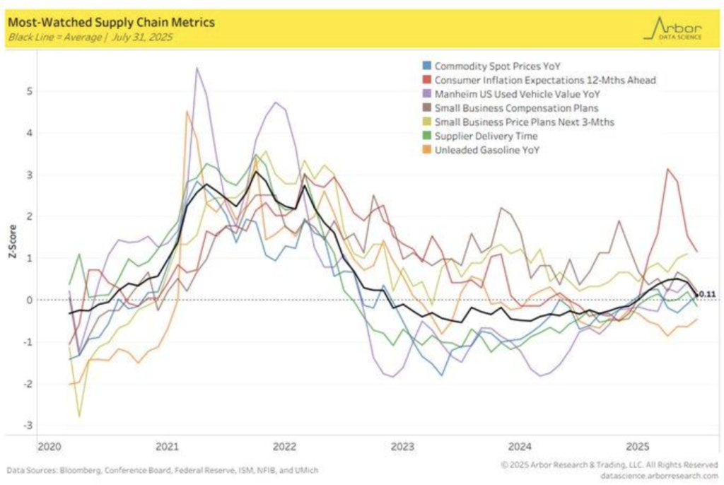 Current statistics tracking supply chain metrics such as commodity prices and ship arrival times between 2021 and 2023 indicate a sharp decline in stress as measured by the black line towards zero. Movement supports recent stabilization of so-called Global Supply Chain Pressure Index and potentially indicates logistics disruptions observed during the pandemic are self-healing post-health crisis. Those findings debunk the supply chain collapse narrative as short-term causes such as port congestion in 2021-2022 were invoked as the main source of stress in a 2023 National Bureau of Economic Research report. The report states 70% of supply chain trouble began with short-term disruptions and not structural causes to support its evidence of recovery.