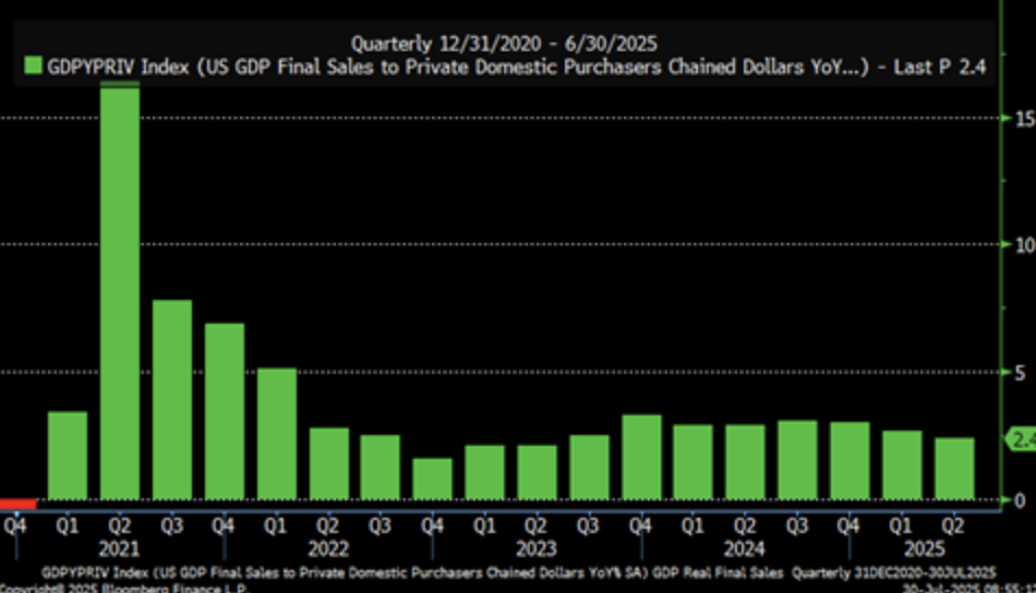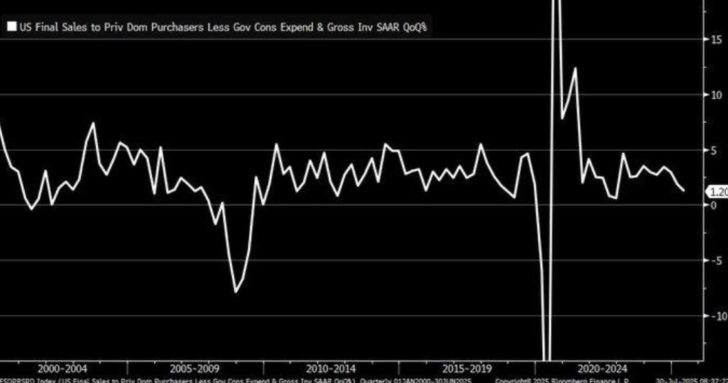American economic growth actually further slows down in the background as last private domestic sales only grew 1.2% in Q2 2025—a dramatic flip from previous periods. This contrasts with the 3.0% top-line GDP growth and follows a Q1 decline of 0.5%, signs of a gap between aggregate production and true private demand. The flip implies most of the reported growth would be more likely the result of transitory retightening of inventories or consumption motivated by the state, and not the consumer spending.