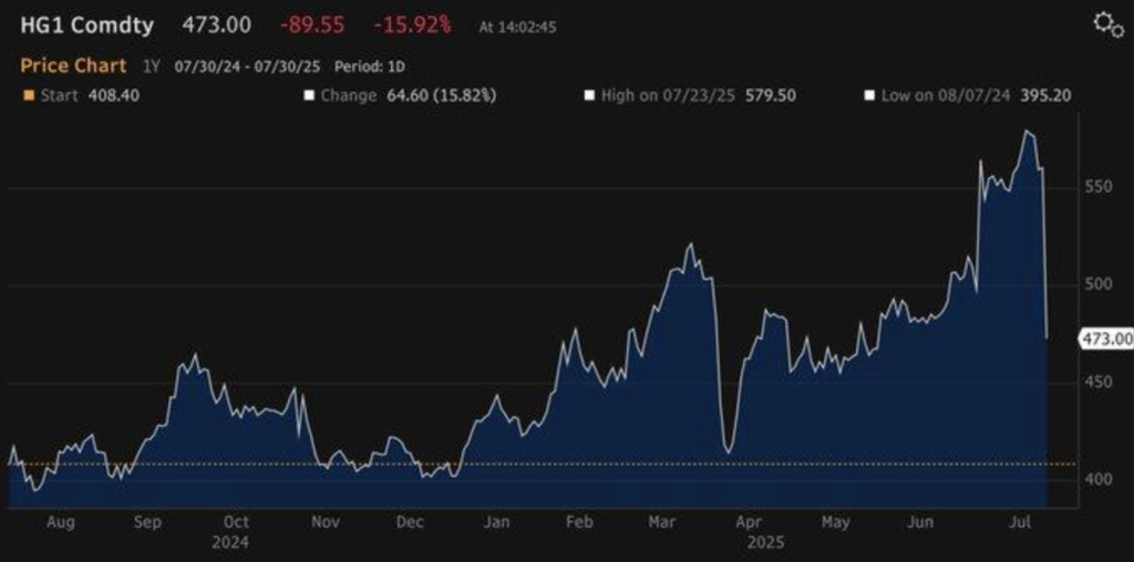 Copper fell 15.32% to $4.73 a pound on July 30, 2025, wiping out weeks of advance following the dramatic reversal of a 50% U.S. tariff on copper imports. The dramatic reversal dashed hopes for domestic premia and triggered a swift market response. The size of the sell-off—a parallel 18.38% decline on the spot market to $4.60—indicates more than recalibration; it is symptomatic of being over-sensitive to trade policy risk.