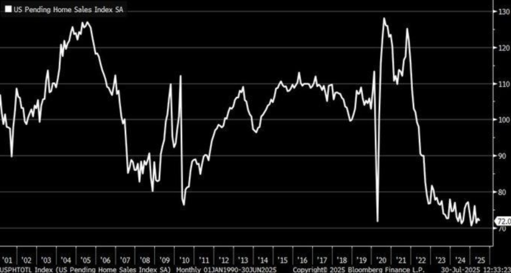 U.S. home market registered another fall in June 2025 as the Pending Home Sales Index decreased 0.8% from last month to stand at 72.0—at a near record low of 2001. Despite a 29% increase in supply over last year, stiffening mortgage rates averaging 6.82% have reduced affordability and dissuaded consumers from entering the market. The fall defied the 0.2% increase consensus forecast, providing further evidence that the monetary policy is still over-constricting the housing demand.