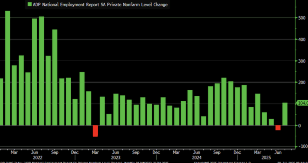U.S. private payrolls increased 104,000 in July 2025 convincingly above market estimates of 76,000 and catching up for downward revised decline of 23,000 in June. The ADP National Employment Report data provides evidence of patchily resilient labour market on the whole. Advances in hospitality and financial services drove the gains and signal selective turnarounds in the style of digital economy themes.