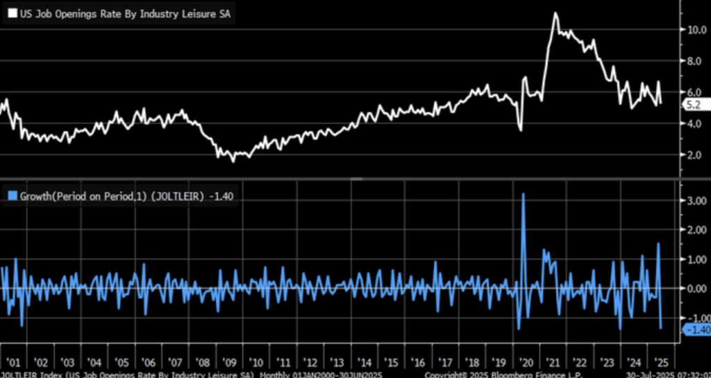 US recreation industry employment available decreased 1.4% in June 2025 and hit the lowest points in December 2023 and March 2020. The fall from BLS labour turnover series portends falling demand on the most consumer-sensitive segment of the economy. The coincidence between thinner household pockets and inflationary intransience itself renders the industry’s labour demand also more cycle-sensitive and less growth-directed.