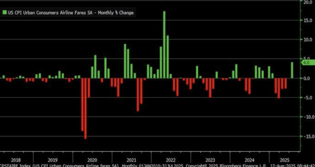 TU.S. city consumer air prices jumped 4% during last month in July 2025 from the previous month, which was the largest month-on-month rise in May 2022, after a combination of healthy travel demand and all-time highs of jet fuel prices, which touched an all-time high of $2.85 a gallon, said the U.S. Energy Information Administration. Such a rise in relation to total 2.7% year-on-year rise in the Consumer Price Index (CPI) would indicate prices in the air are running ahead of total inflation. Such deviation is causing an inflationary issue which is unique to segments in travel and the transport sector.