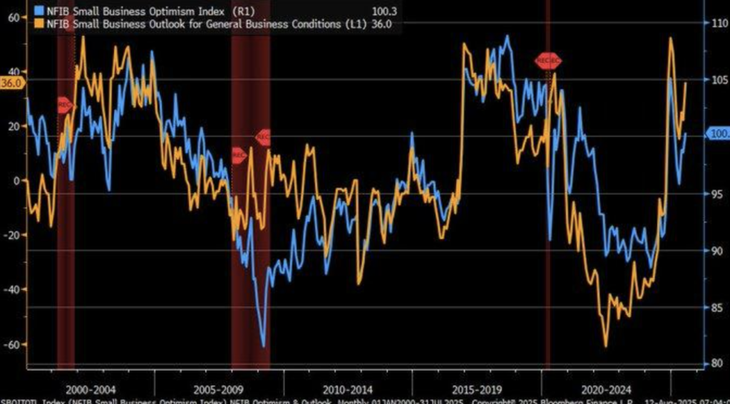 The NFIB Small Business Optimism Index gained 1.7 points to 100.3 in July 2025, beating the 52-year average of 98. The increase is mostly due to better hiring plans and a better perception of expansion opportunities. This optimism is, however, moderated by a steep 8-point increase in the uncertainty index to 97, fueled by persistent tariffs and international conflicts. Small businesses, despite the positive sentiment, continue to worry about external factors affecting their stability, which indicates that the current recovery could be tenuous.
