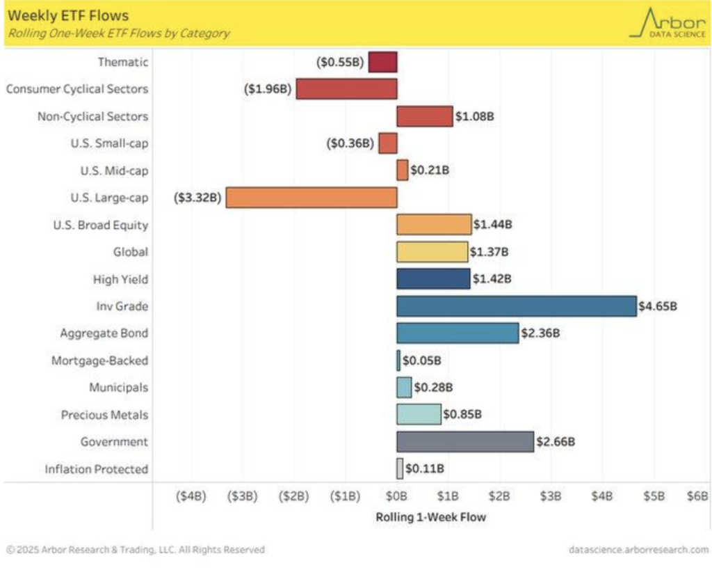 The massive $4.68 billion inflow into investment-grade bond ETFs in the last week is a stark contrast to a $3.32 billion outflow from U.S. large-cap ETFs, reflecting a strong tilt towards safer assets as economic uncertainty increases. This is consistent with historical precedence, as investors tend to rotate into bonds when there’s volatility in equity markets. A 2023 Federal Reserve study concluded that investment-grade bonds tend to outperform equities by 2-3% per year during downturns, which implies that investors are looking for stability amid potential risks, especially in consumer cyclical sectors like retail and autos.