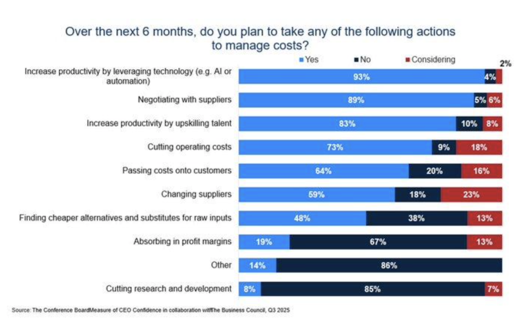 However, only 64% of CEOs intend to pass on higher costs to consumers, which implies a more restrained reaction than the ones taken during previous inflationary cycles. A Reuters report in 2022 noted that while companies were in a position to pass on costs to consumers, it raised concerns about household affordability. This implies that while companies are focusing on productivity improvements, they are also cognizant of the potential for consumer backlash in an already strained economic environment. On the other hand, cutting research and development (R&D) expenditure is the lowest on the list of cost-reduction choices, with only 14% of CEOs supporting this measure. This contrasts with findings in a 2023 TK Associates study, in which 61% of CEOs felt they were unprepared for crises, meaning that R&D investment might be a long-shot risk in volatile markets. With companies prioritizing automation over innovation, there could be a potential trade-off in the development of new products and services, a point that would have to be closely monitored by analysts.