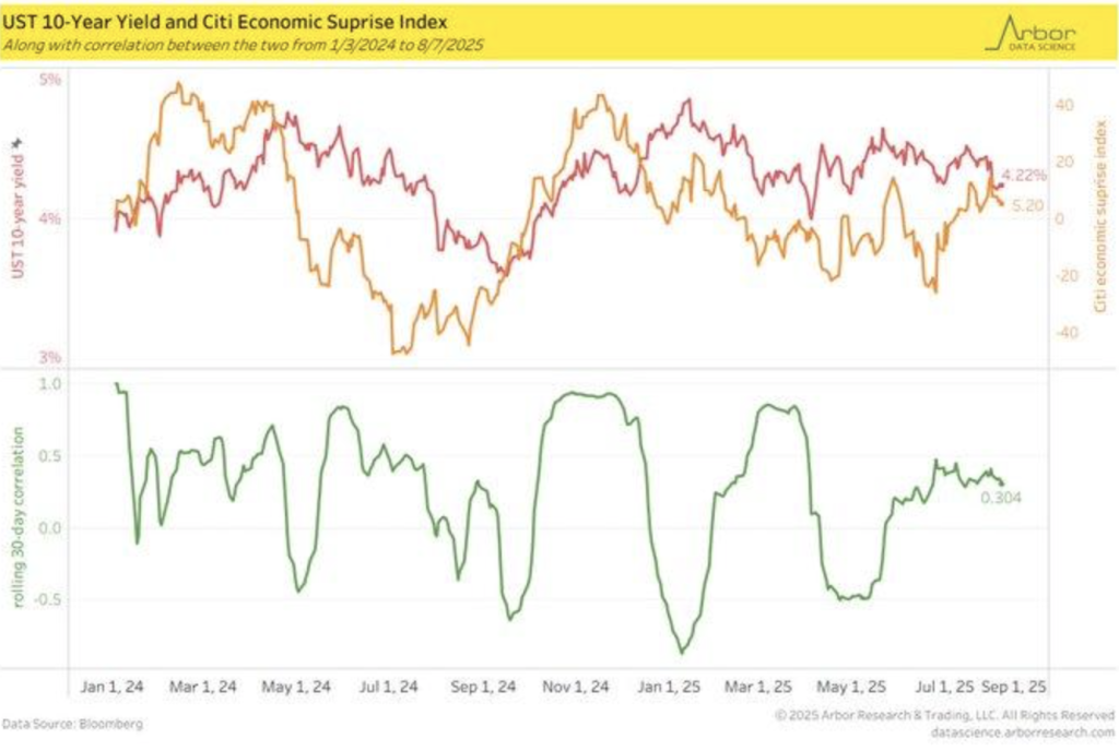 A rising positive correlation between the 10-year Treasury yield and the Citi U.S. Economic Surprise Index since mid-2025 suggests that surprise economic data is having a growing influence on long-term interest rates. This is supported by a 2023 Federal Reserve study, which estimated that yield sensitivity to economic surprises rose by 15% post-pandemic due to heightened market volatility. With economic data still surprising, Treasury yields are now apparently more sensitive to the shifts, amplifying the effect of surprise events on long-term interest rates.