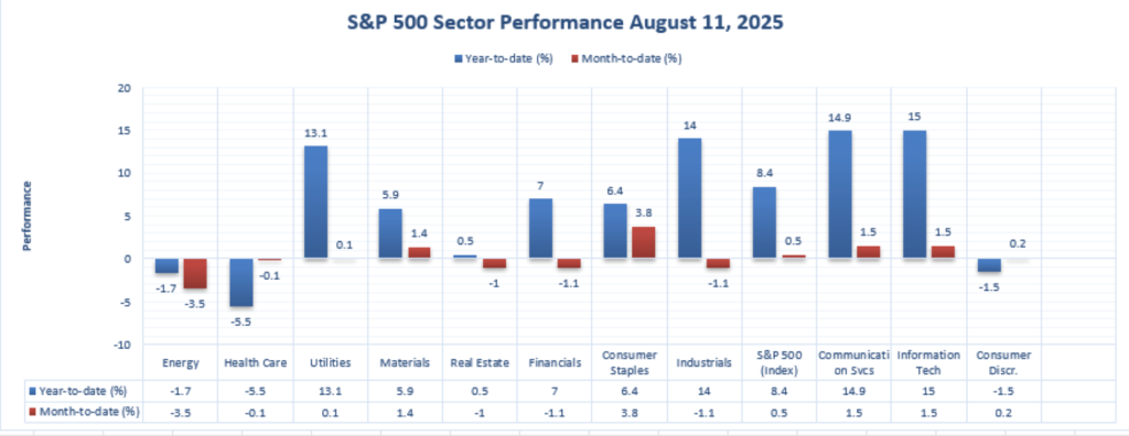 At Zaye Capital Markets, we remain to monitor sector performance in the overall equity universe. Through August 11, 2025, to date, Information Technology has been the strongest sector in the S&P 500, reestablishing its leadership in a year of volatility and growth selectivity.